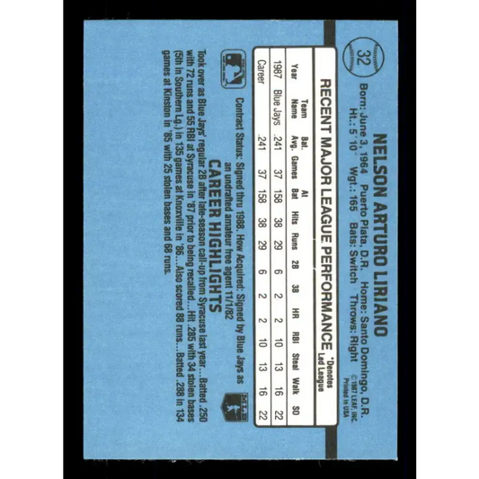 1988 Donruss #32 Nelson Liriano/ EX RC Rookie Toronto Blue Jays Baseball Card