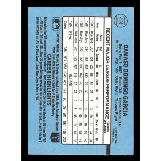 1988 Donruss #414 Damaso Garcia EX Atlanta Braves Baseball Card