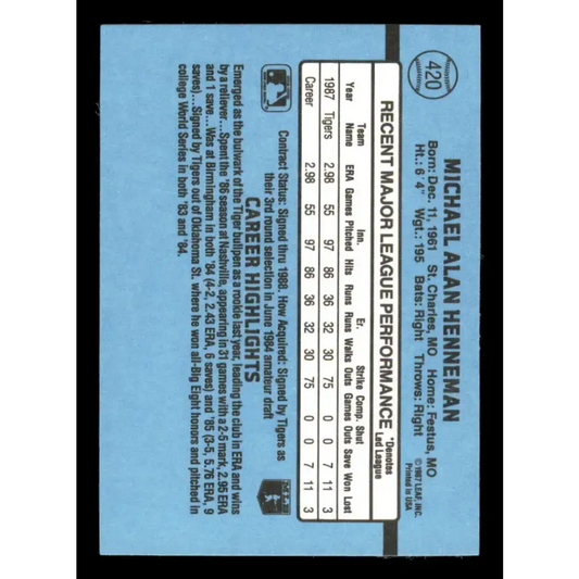 1988 Donruss #420 Mike Henneman EX RC Rookie Detroit Tigers Baseball Card