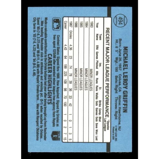 1988 Donruss #494 Mike Griffin EX Baltimore Orioles Baseball Card