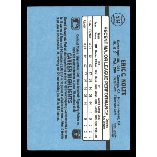 1988 Donruss #534 Eric Nolte EX RC Rookie San Diego Padres Baseball Card