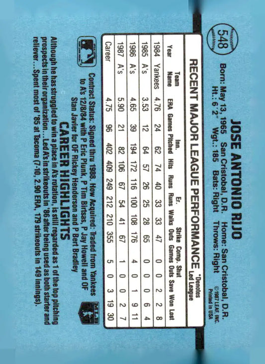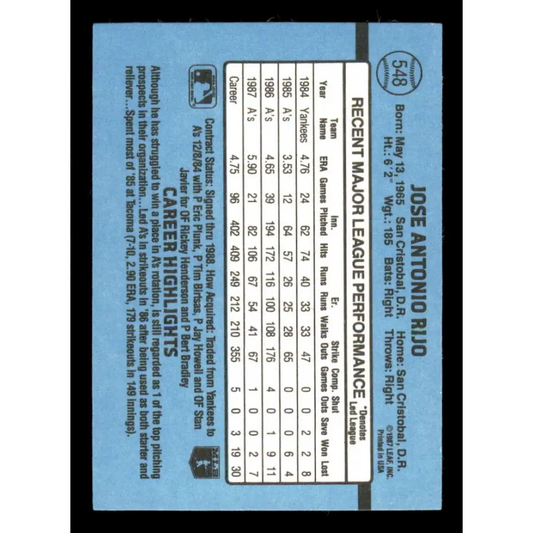 1988 Donruss #548 Jose Rijo EX Oakland Athletics Baseball Card
