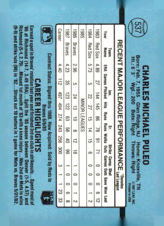 1988 Donruss #537 Charlie Puleo EX Atlanta Braves Baseball Card