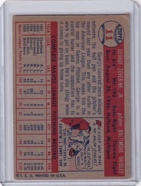 1957 Topps Baseball #11 George Zuverink - Baltimore Orioles