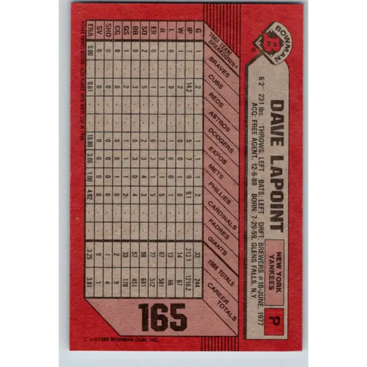 1989 Bowman #165 Dave LaPoint NM-MT New York Yankees Baseball Card