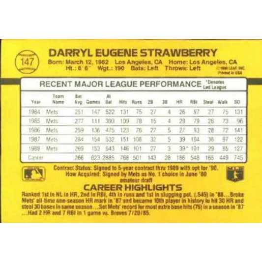 1989 Donruss #147 Darryl Strawberry NM-MT New York Mets Baseball Card