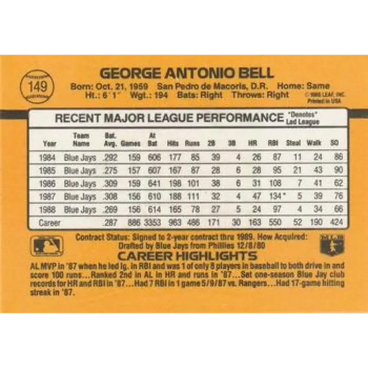 1989 Donruss #149 George Bell NM-MT Toronto Blue Jays Baseball Card