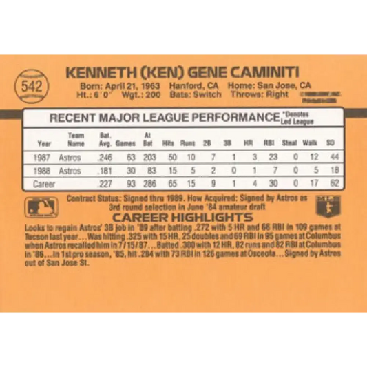 1989 Donruss #542 Ken Caminiti Houston Astros Baseball Cards EX/NM ID:59121