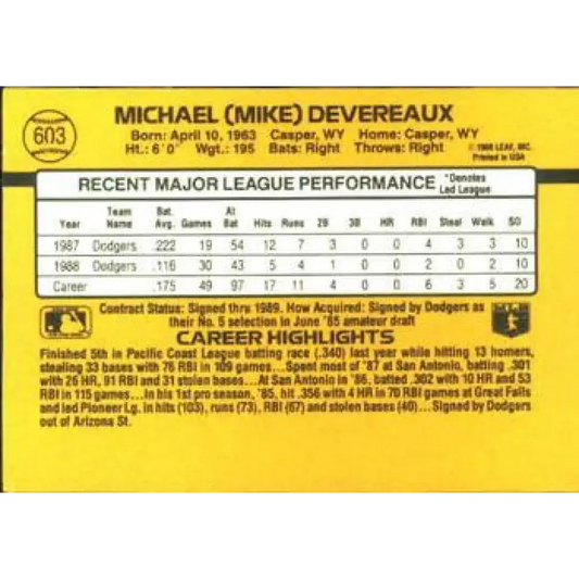 1989 Donruss #603 Mike Devereaux NM-MT Los Angeles Dodgers Baseball Card