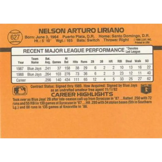 1989 Donruss #627 Nelson Liriano DP NM-MT Toronto Blue Jays Baseball Card