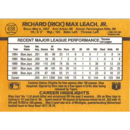 1989 Donruss #638 Rick Leach NM-MT Toronto Blue Jays Baseball Card