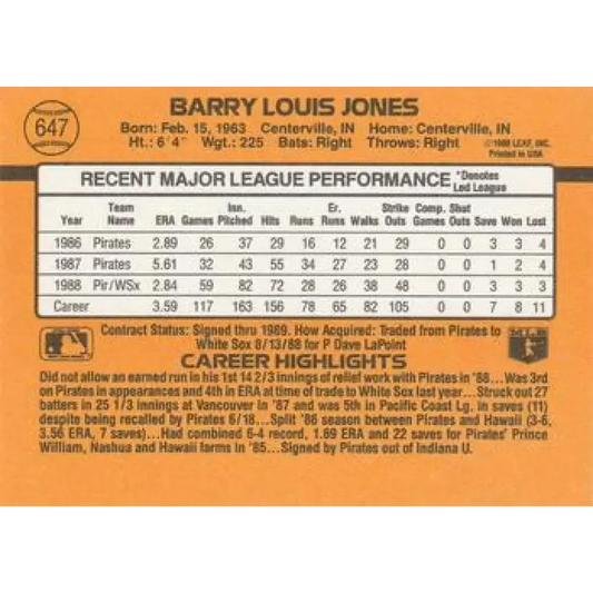 1989 Donruss #647 Barry Jones NM-MT Chicago White Sox Baseball Card