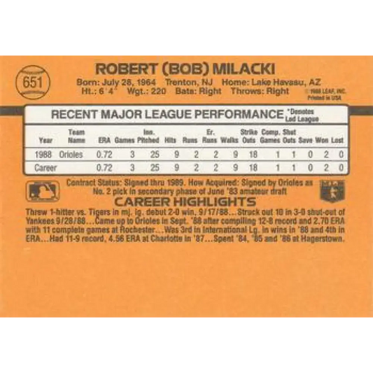 1989 Donruss #651 Bob Milacki NM-MT RC Rookie Baltimore Orioles Baseball Card