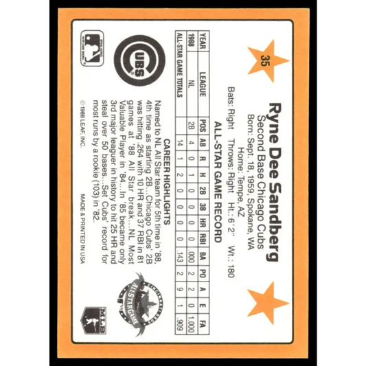 1989 Donruss All-Stars #35 Ryne Sandberg EX Chicago Cubs Baseball Card
