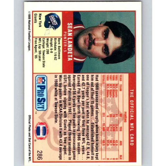 1989 Pro Set #286 Sean Landeta NM-MT New York Giants Football Card