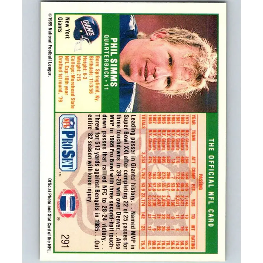 1989 Pro Set #291 Phil Simms NM-MT New York Giants Football Card