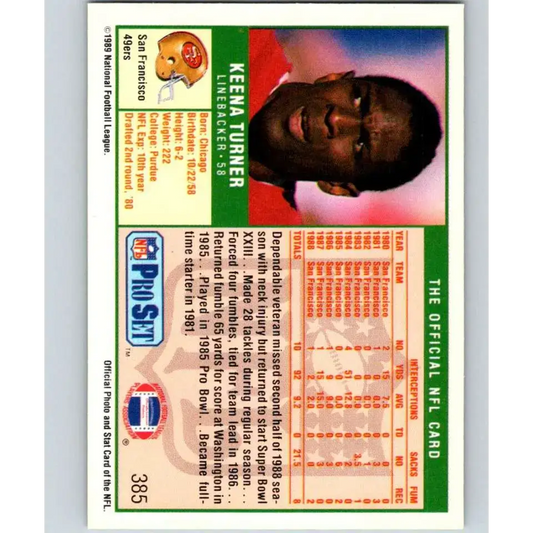 1989 Pro Set #385 Keena Turner NM-MT San Francisco 49ers Football Card