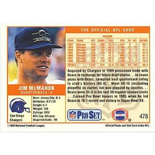 1989 Pro Set #478a Jim McMahon NM-MT San Diego Chargers Football Card