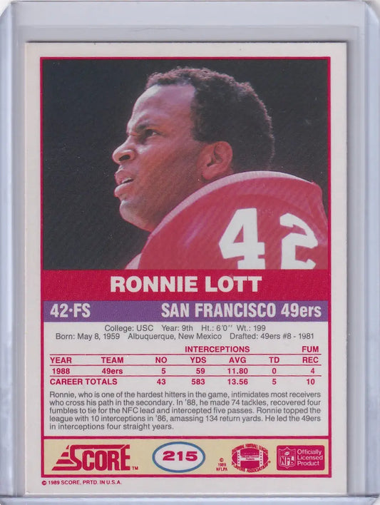 1989 Score Football #215 Ronnie Lott - San Francisco 49ers