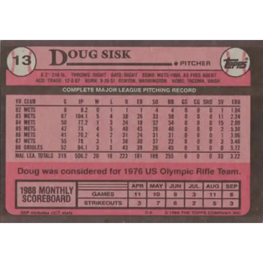 1989 Topps #13 Doug Sisk NM-MT Baltimore Orioles Baseball Card