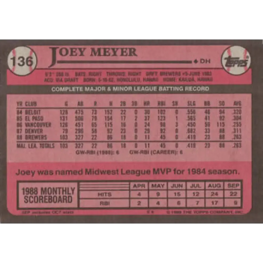 1989 Topps #136 Joey Meyer Milwaukee Brewers Baseball Cards NM Near ID:64670