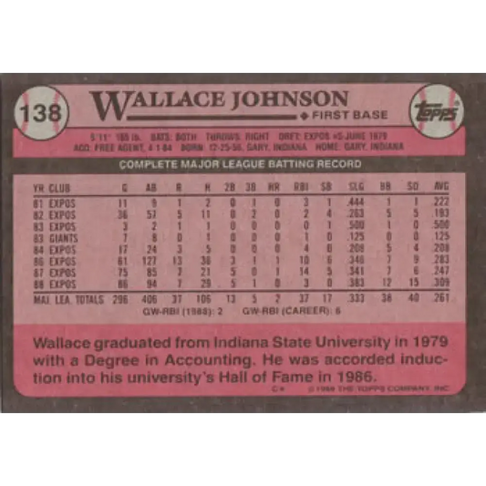 1989 Topps #138 Wallace Johnson NM-MT Montreal Expos Baseball Card