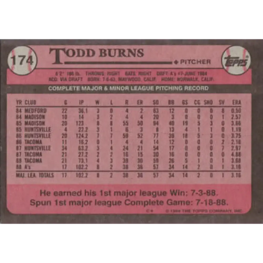 1989 Topps #174 Todd Burns NM-MT Oakland Athletics Baseball Card
