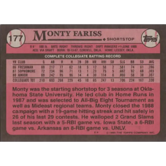 1989 Topps #177 Monty Fariss FDP NM-MT RC Rookie Texas Rangers Baseball Card