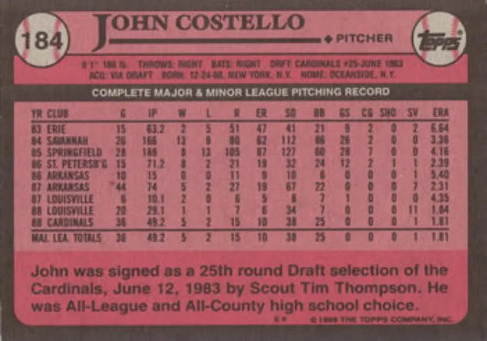 1989 Topps #184 John Costello NM-MT St. Louis Cardinals Baseball Card
