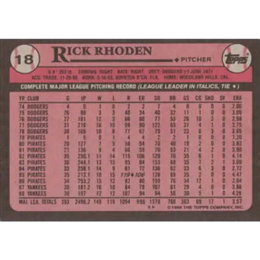 1989 Topps #18 Rick Rhoden NM-MT New York Yankees Baseball Card