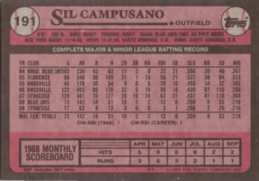 1989 Topps #191 Sil Campusano Toronto Blue Jays Baseball Cards EX/NM ID:61599