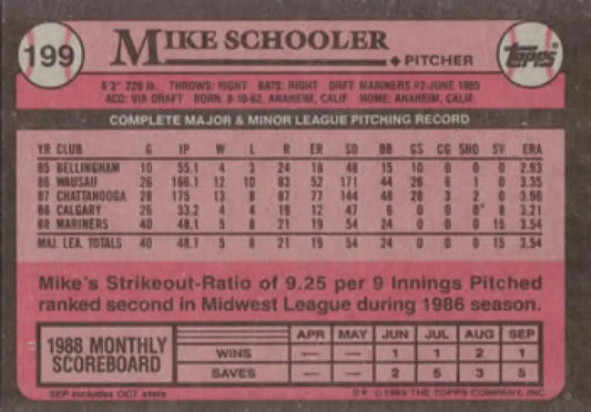 1989 Topps #199 Mike Schooler NM-MT RC Rookie Seattle Mariners Baseball Card
