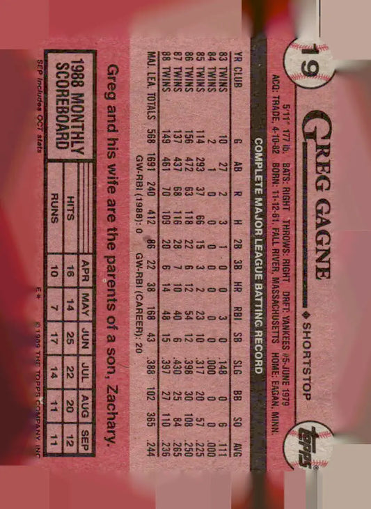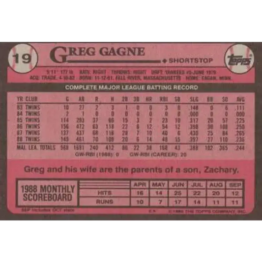 1989 Topps #19 Greg Gagne NM-MT Minnesota Twins Baseball Card