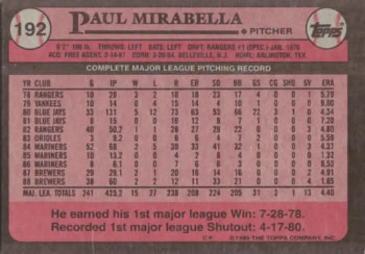 1989 Topps #192 Paul Mirabella NM-MT Milwaukee Brewers Baseball Card