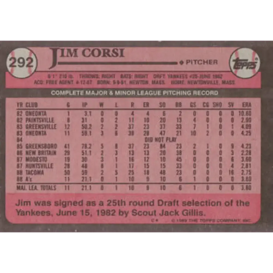 1989 Topps #292 Jim Corsi NM-MT RC Rookie Oakland Athletics Baseball Card
