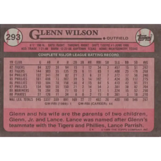 1989 Topps #293 Glenn Wilson NM-MT Pittsburgh Pirates Baseball Card