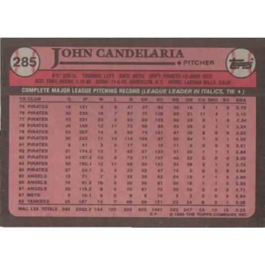 1989 Topps #285 John Candelaria NM-MT New York Yankees Baseball Card
