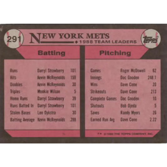 1989 Topps #291 Darryl Strawberry/Kevin McReynolds/Keith Hernandez New York Mets TL NM-MT New York Mets Baseball Card