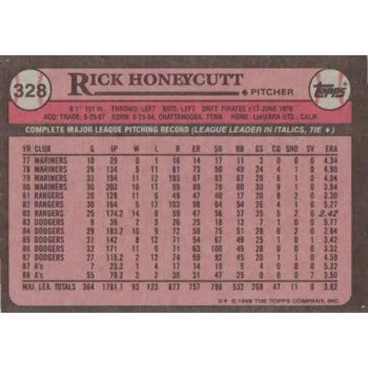 1989 Topps #328 Rick Honeycutt NM-MT Oakland Athletics Baseball Card