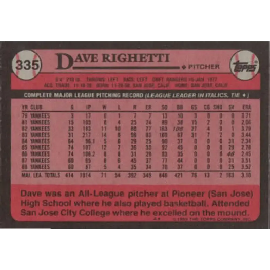 1989 Topps #335 Dave Righetti NM-MT New York Yankees Baseball Card