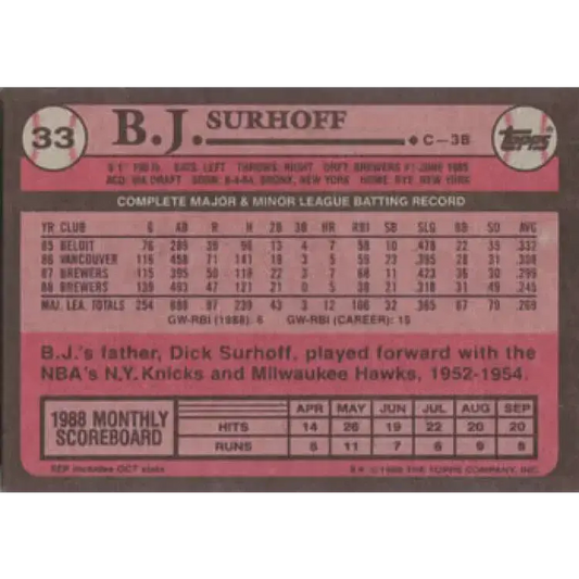 1989 Topps #33 B.J. Surhoff NM-MT Milwaukee Brewers Baseball Card