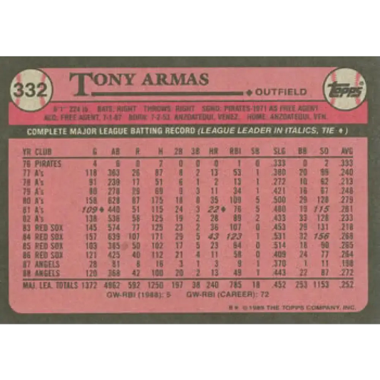 1989 Topps #332 Tony Armas NM-MT California Angels Baseball Card
