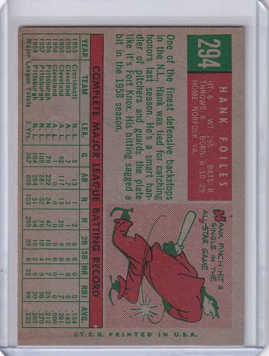 1959 Topps Baseball #294 Hank Foiles - Pittsburgh Pirates