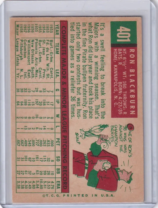 1959 Topps Baseball #401 Ron Blackburn - Pittsburgh Pirates