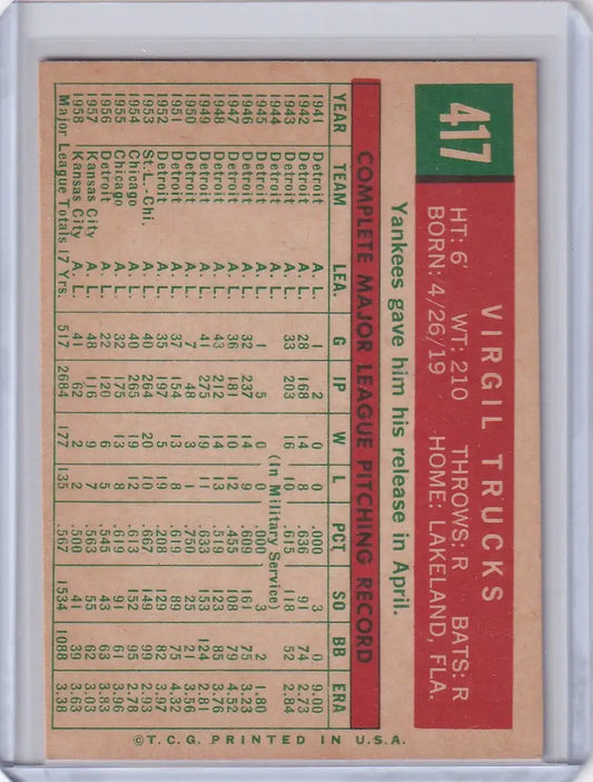 1959 Topps Baseball #417 Virgil Trucks - New York Yankees