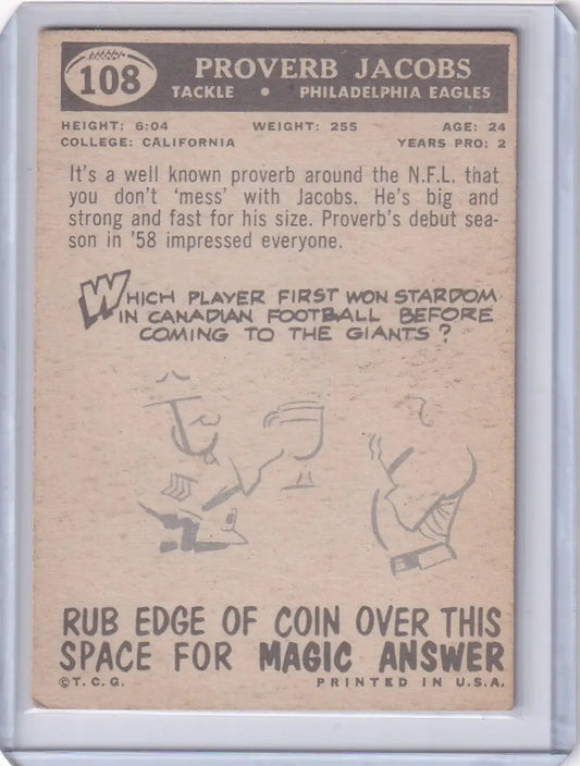 1959 Topps Football # 108 Proverb Jacobs RC - Philadelphia Eagles
