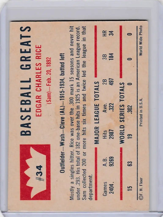 1960 Fleer Baseball Greats #34 Sam Rice Cleveland Indians EX