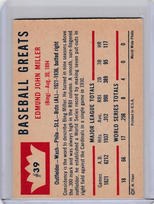 1960 Fleer Baseball Greats #39 Bing Miller Philadelphia Athletics EXMT