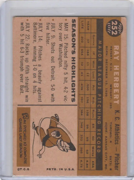 1960 Topps #252 Ray Herbert Kansas City Athletics EXMT