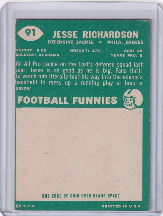 1960 Topps Football # 91 Jesse Richardson - Philadelphia Eagles